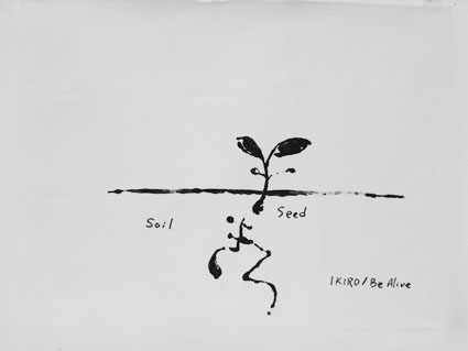 Takahiro has been doing IKIRO workshops with people. In his workshop usually he gives a lecture with IKIRO documents, then people write IKIRO. They write 2 times, and they get one sheet of IKIRO, and one is kept for the IKIRO Project as a document. After the workshop people put their own IKIRO sheets in their houses or offices, then people will get energy or inspiration from them. Takahiro thinks these IKIRO have special meaning for people because they wrote the words IKIRO by themselves.