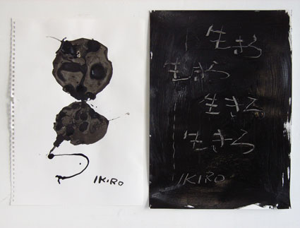 Takahiro and Hironari Kubota, two Japanese artists performed together. It was an exhibition about the exchanging spirit and energy of the two artists. Hironari is an artist who created a sculpture of a rotating car, and performs with Japanese music. Takahiro kept writing the word IKIRO throughout the exhibition at the IKIRO Museum he made. Takahiro and Hironari had a kind of ritualistic performance together. For example Takahiro wrote IKIRO on Hironari's body before his Trabant's performance.